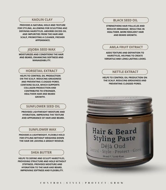 Embrace the simplicity of nature's finest ingredients, harmonized with the warm and inviting scents of when the East meets the West. Notes of warm spicy tobacco, oud wood, sweet vanilla, and amber with a smoky touch create a comforting sensory experience. Whether preparing for the day ahead, unwinding at night, or for a special event, our styling paste offers a rejuvenating blend that soothes both body and soul.