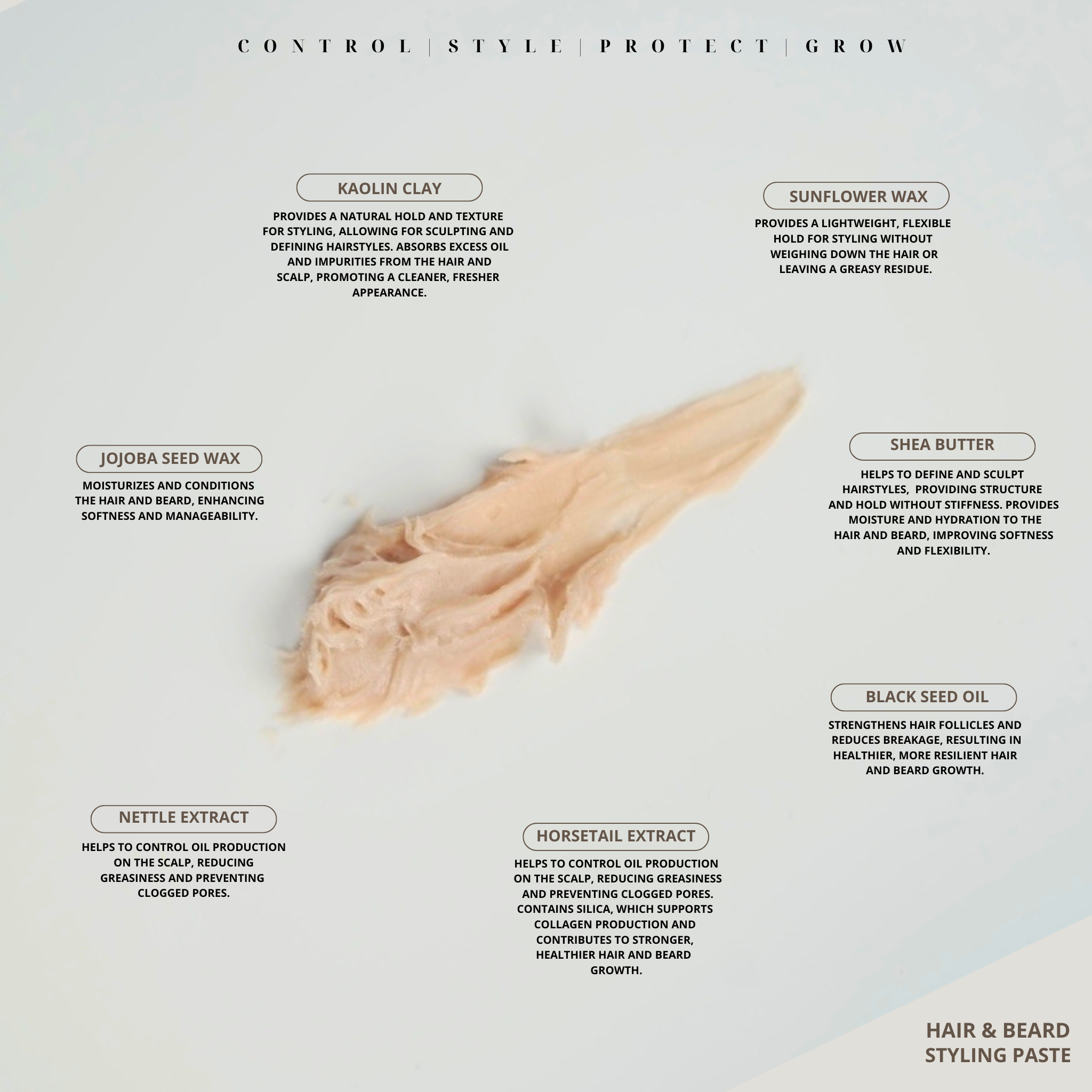 KAOLIN CLAY PROVIDES A NATURAL HOLD AND TEXTURE FOR STYLING, ALLOWING FOR SCULPTING AND DEFINING HAIRSTYLES. ABSORBS EXCESS OIL AND IMPURITIES FROM THE HAIR AND SCALP, PROMOTING A CLEANER, FRESHER APPEARANCE.